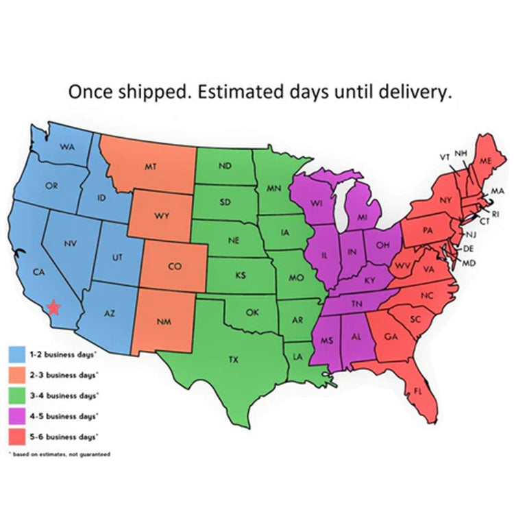 Most of our orders are delivered using FedEx and USP Ground services and arrive within 5 days after the order is processed, depending on where in the country you’re located. See the below map for a general estimate of delivery times, based on FedEx Ground transit. Please note that delivery time may vary and depends on the carrier.